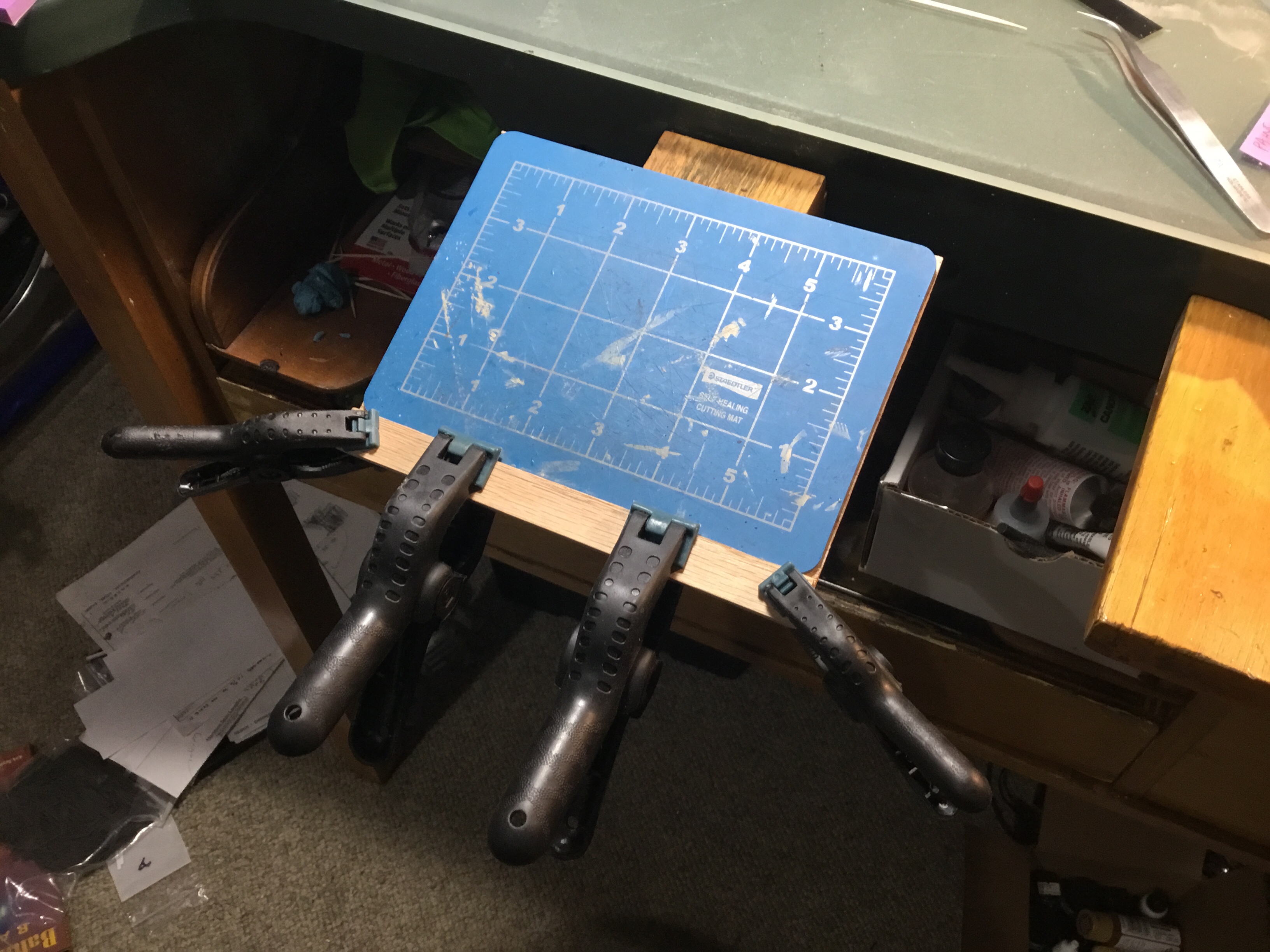 I don’t do a lot of filing and soldering up close like a jeweler, but I do cut and trim small plastic parts with an X-acto knife and prefer them close to my body for precision and control. So I converted the anvil to a cutting surface with a small piece of oak and a cutting mat. It has slight angle to put my hand in a more natural and ergonomic position when cutting.