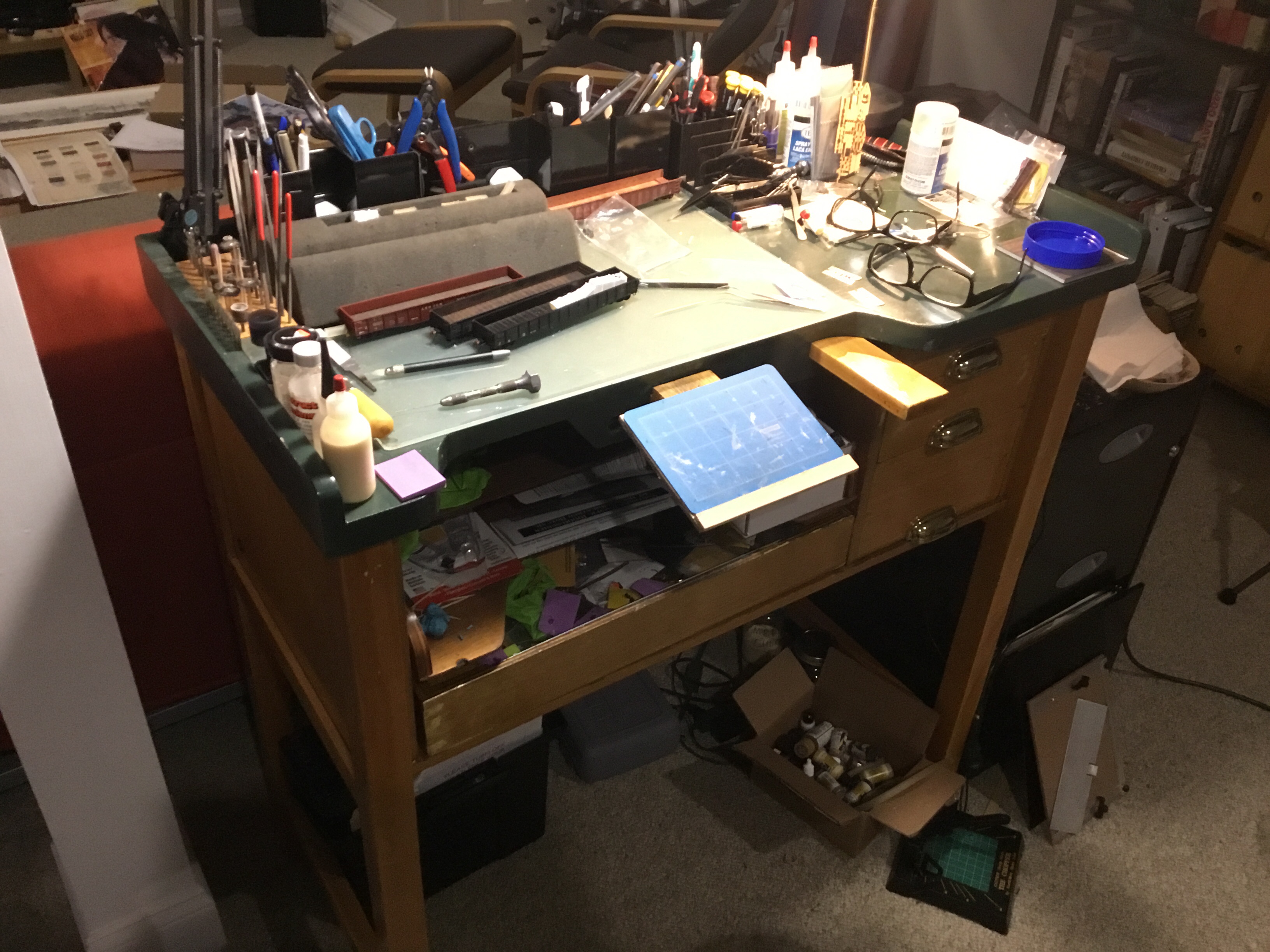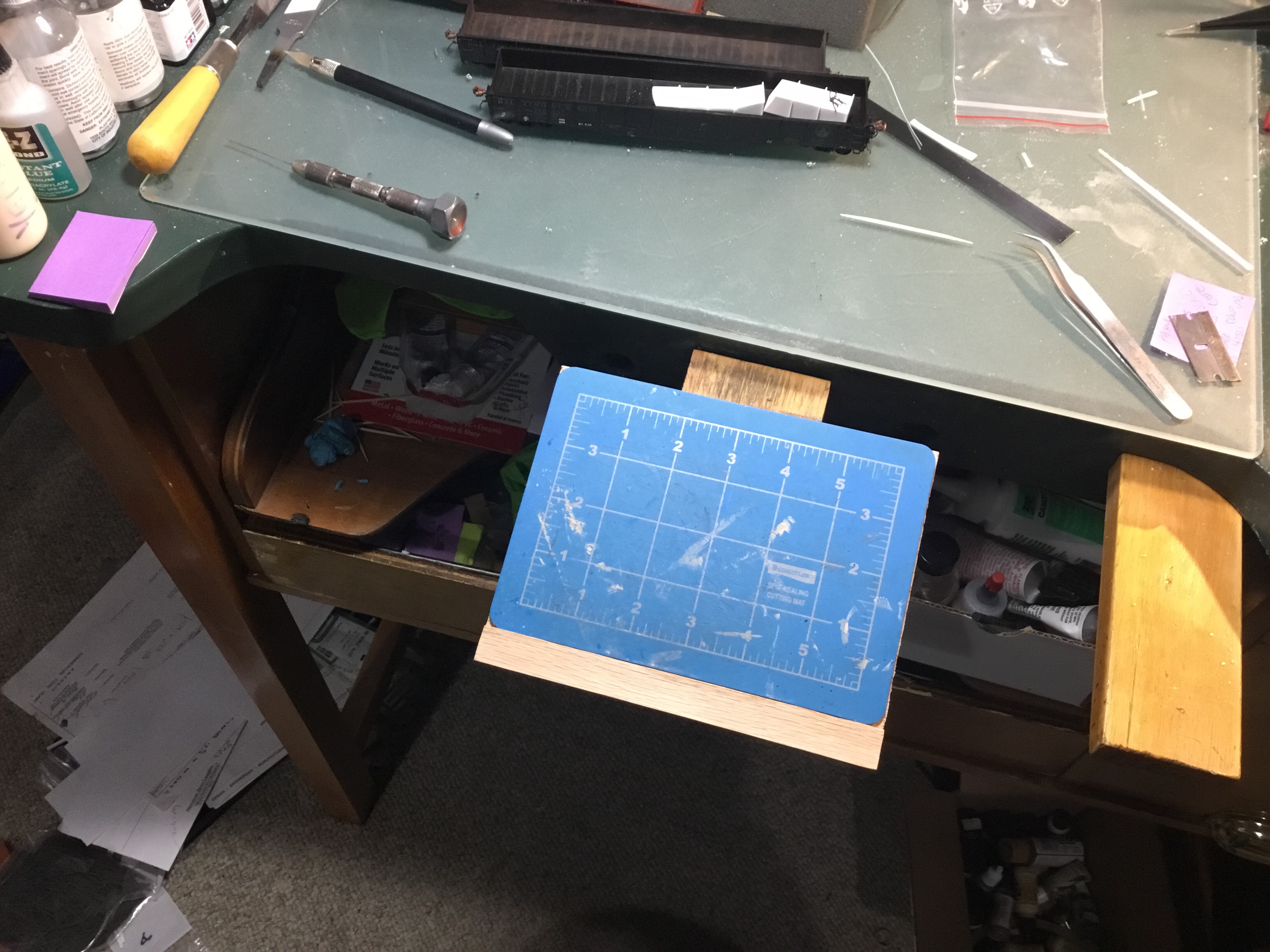 Finished, an ergonomic cutting surface close to my body with an arm rest to the right to steady my cutting arm with a catch tray below that I can pull it out close to my knees to catch scraps or the occasional dropped part. Not an earth changing improvement but an incremental one that makes my modeling easier and more precise.