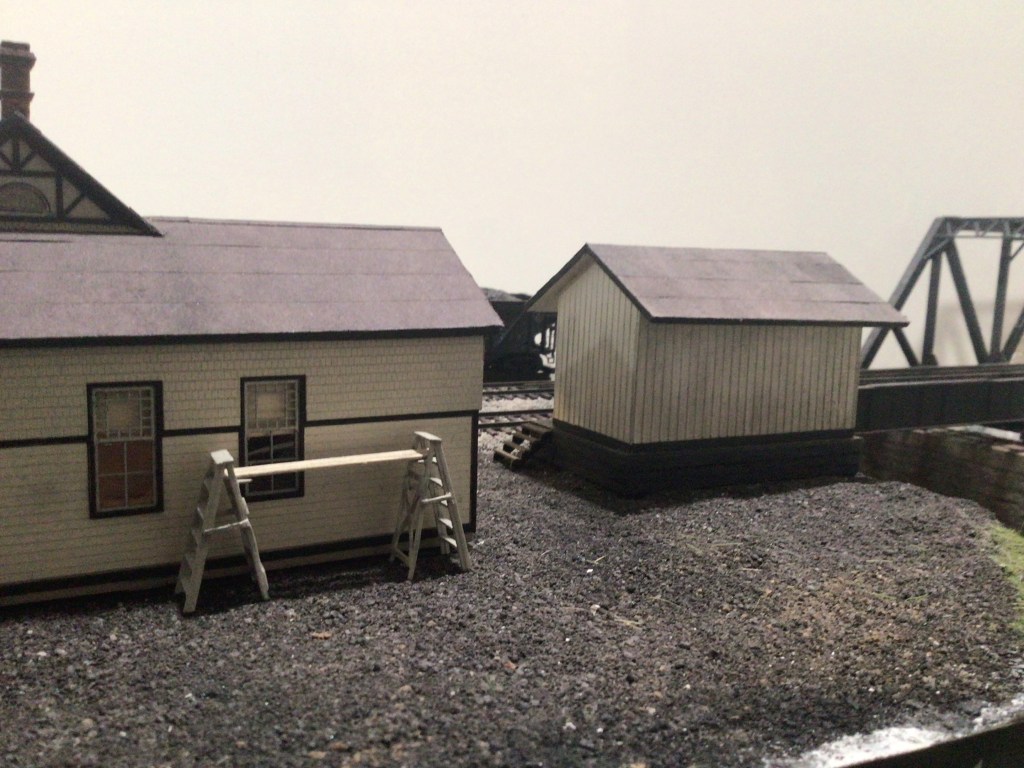 How to model this elusive freight structure? Photos show board and batten siding and the building on a raised platform. The overhead view shows a peaked roof structure about 1/4 the length of the station and half its width. Their are standard B&O plans for a 16’x 20′ freight house, so maybe that size is appropriate. I know modelers build on less information and this may be all I ever find, so that’s what I am going with. On the up side, as soon as I complete the structure we all know a new photo will turn up. If so, at least the historical record can be set straight and I’ll have another structure to build.