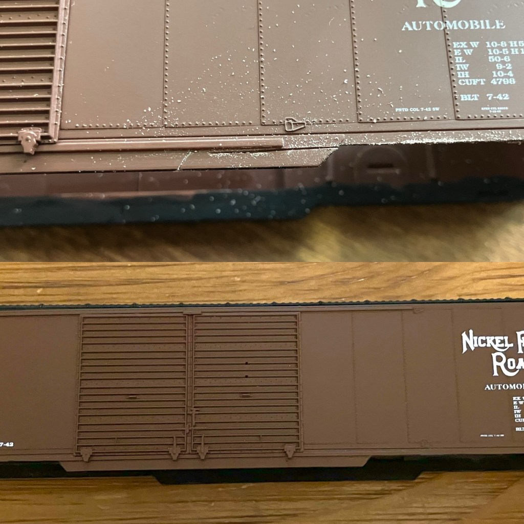 The car to the right is an Atlas RTR 40′ Postwar boxcar I am modifying at the same time with similar parts.