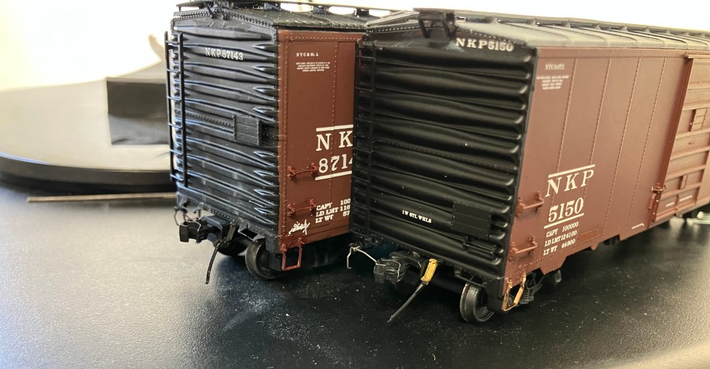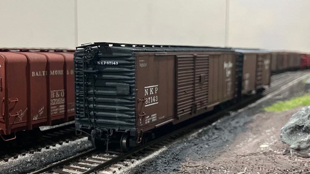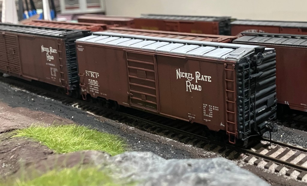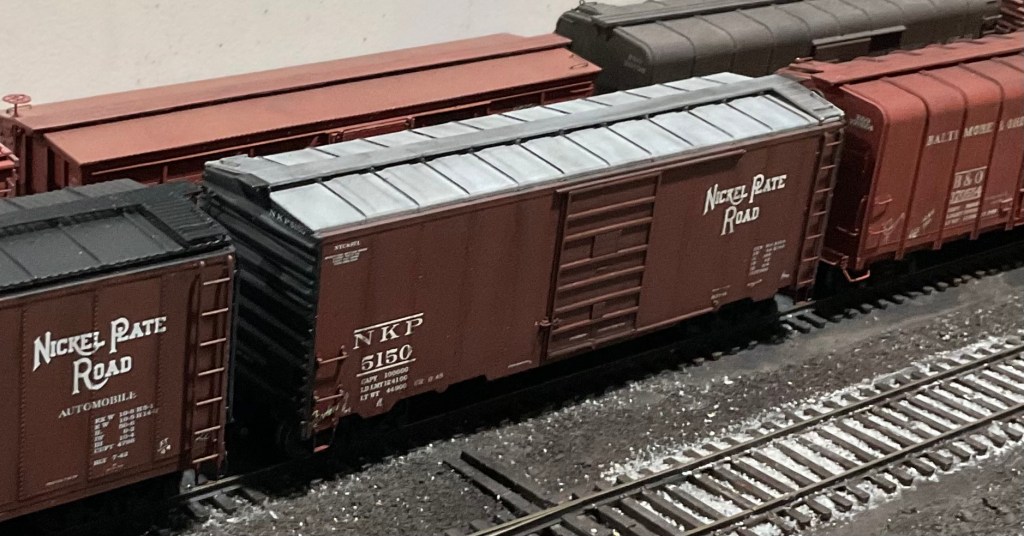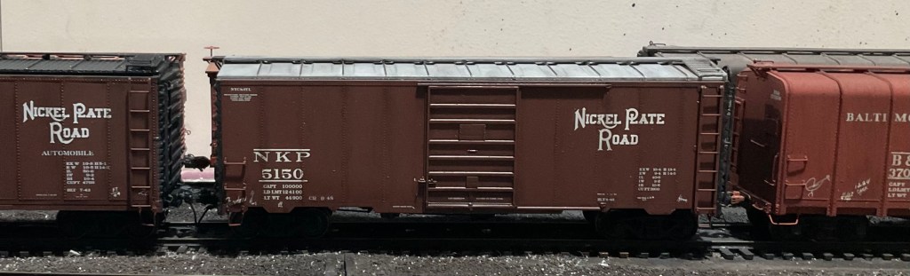 While I was modifying this kit, I found a ready to run NKP boxcar on the shelf that could use some of the same TLC. It is an Atlas ready to run 40′ Postwar Boxcar w/7′ Door Road #5150 (Part # 150-20004251) with a broken coupler mount box and shiny silver roof. Instead of replacing the roof, I had to tone it down with some light oversprays of Vallejo Model Air 71.005 Grey Blue and 71.050 Light Grey, followed by the seam caps painted black with a Faber-Castell Pitt Artist Pen (it is good for reefer hardware also). This car got slightly less weathering because the paint job is about five years newer in my era. Now I have some roof variety and NKP boxcars on the layout.